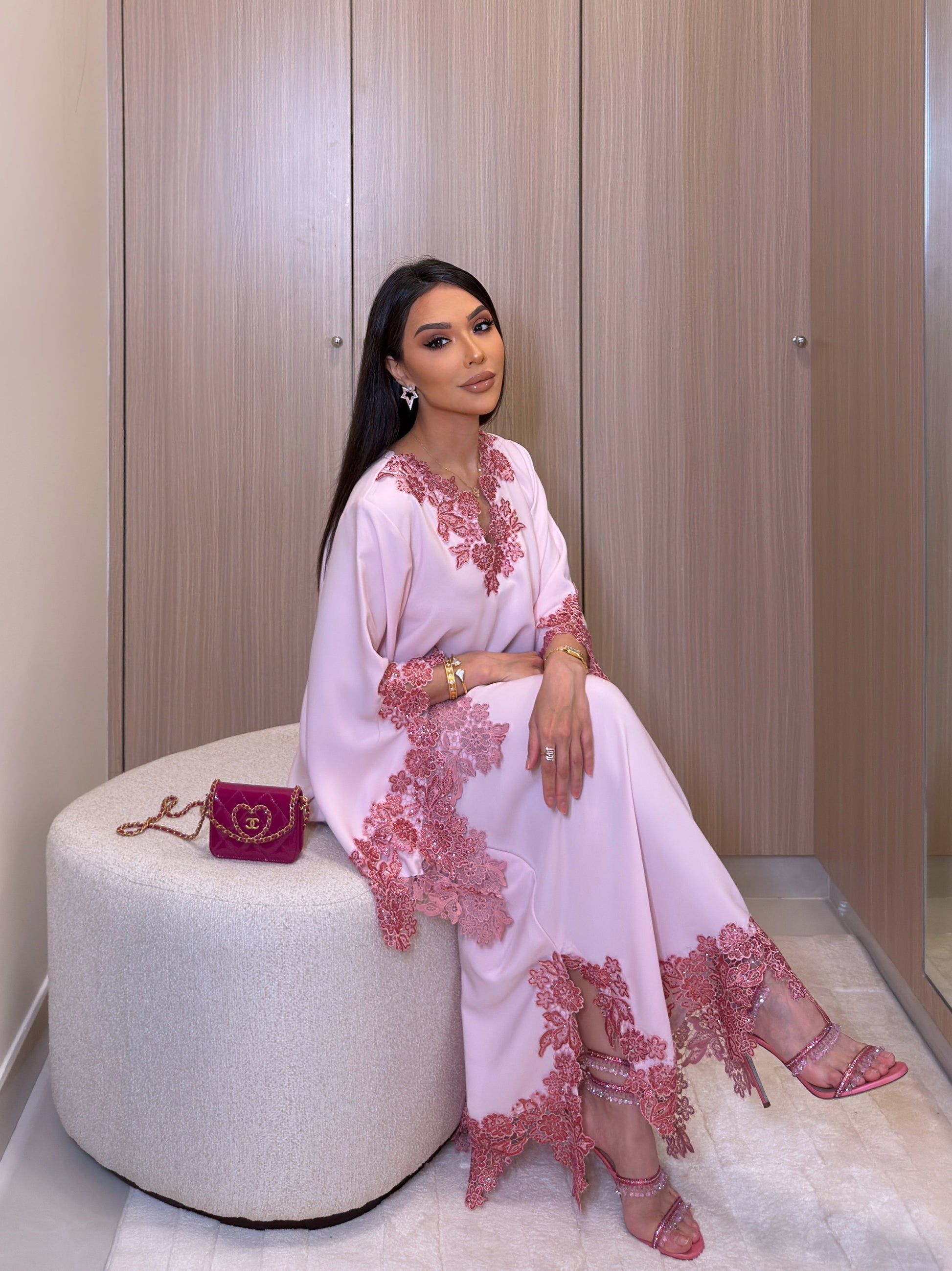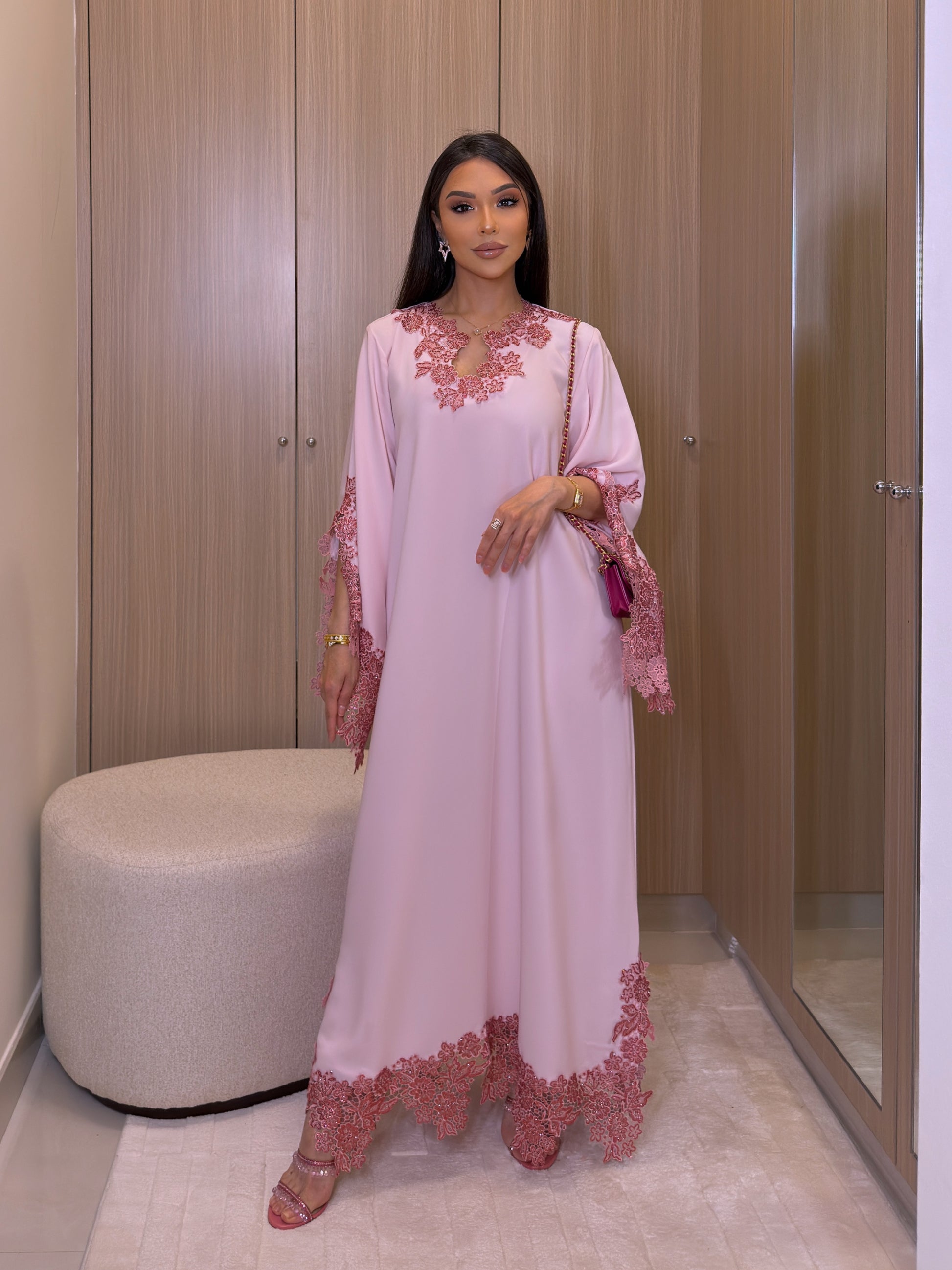 A soft blush dress crafted in a fluid silhouette, elevated with delicate lace embroidery along the neckline, sleeves, and hem.This piece is fully customized to your measurements.