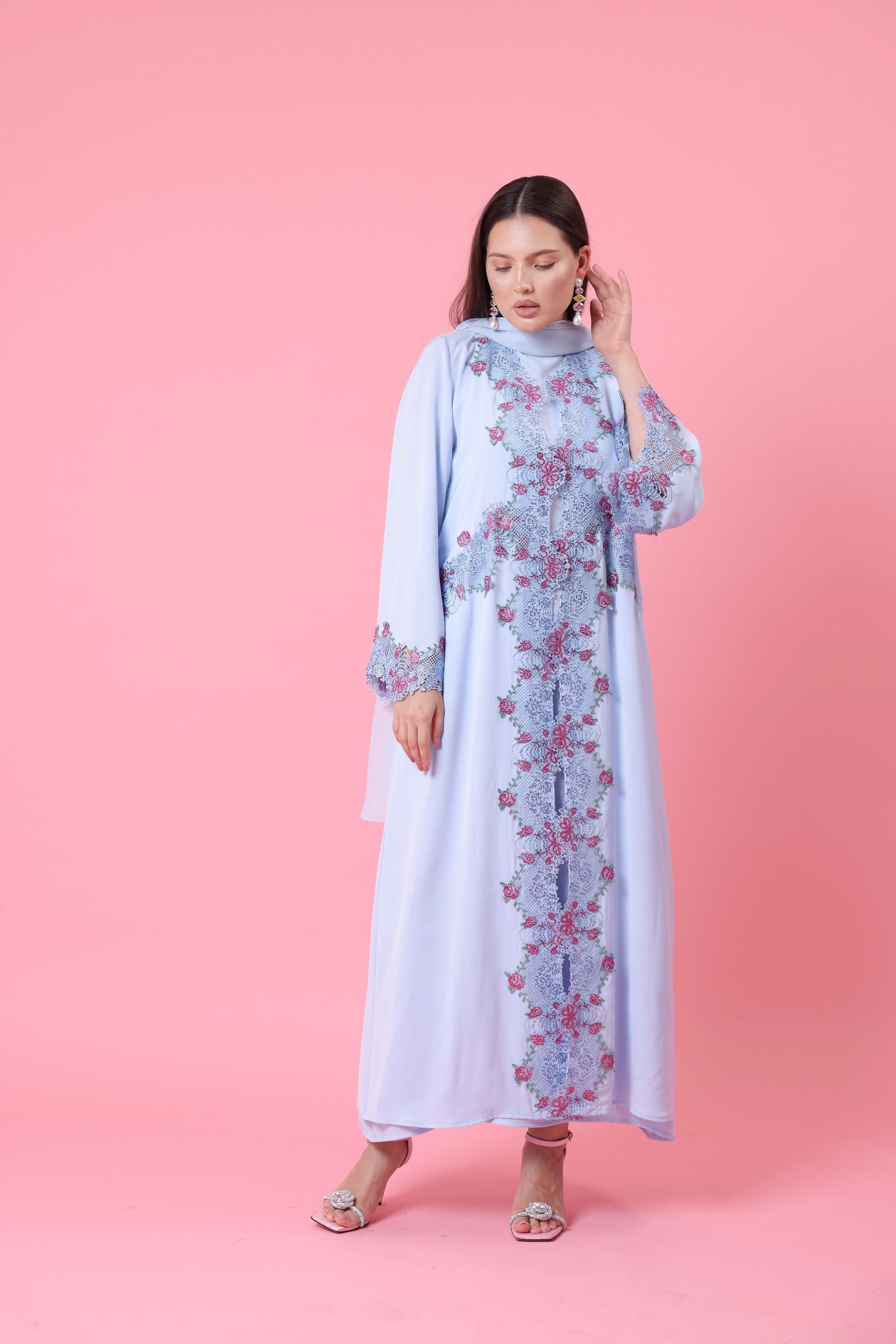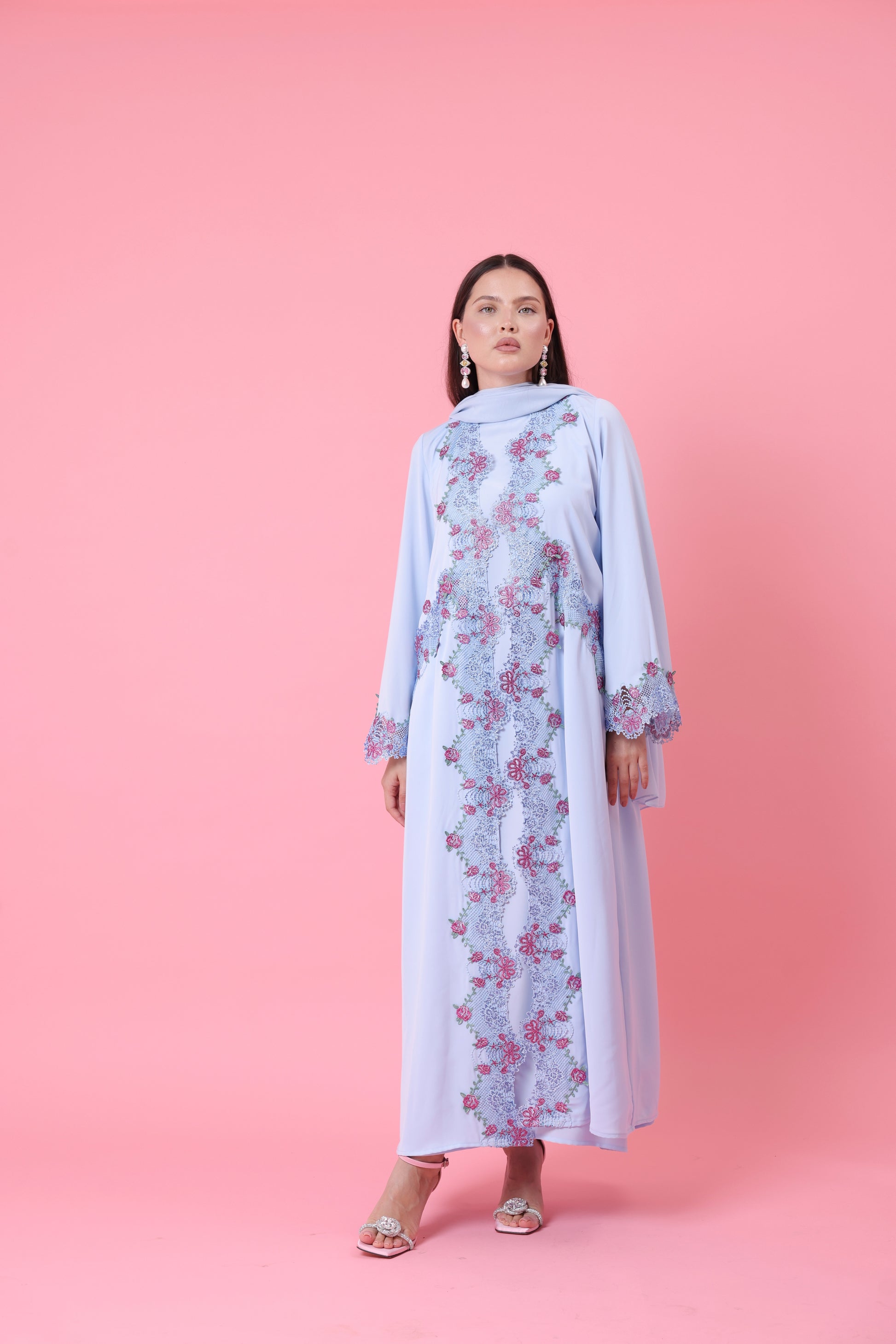 A statement sparkle in pastel sky-blue, adorned with intricate lilac and rose embroidery cascading down the center. Ethereal yet confident, designed for effortless movement and day-to-evening grace. Includes matching sheila and inner dress for a complete, refined look.