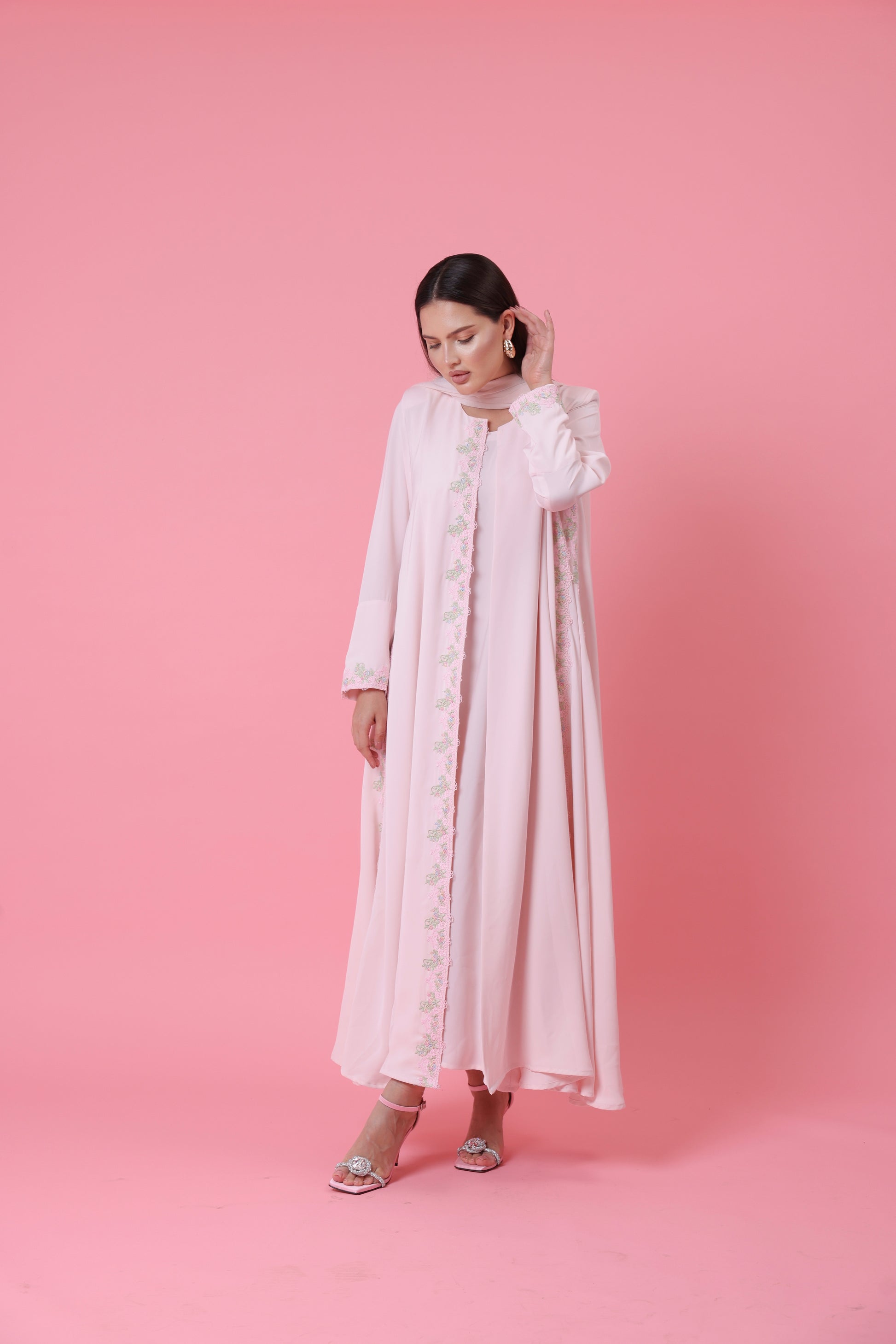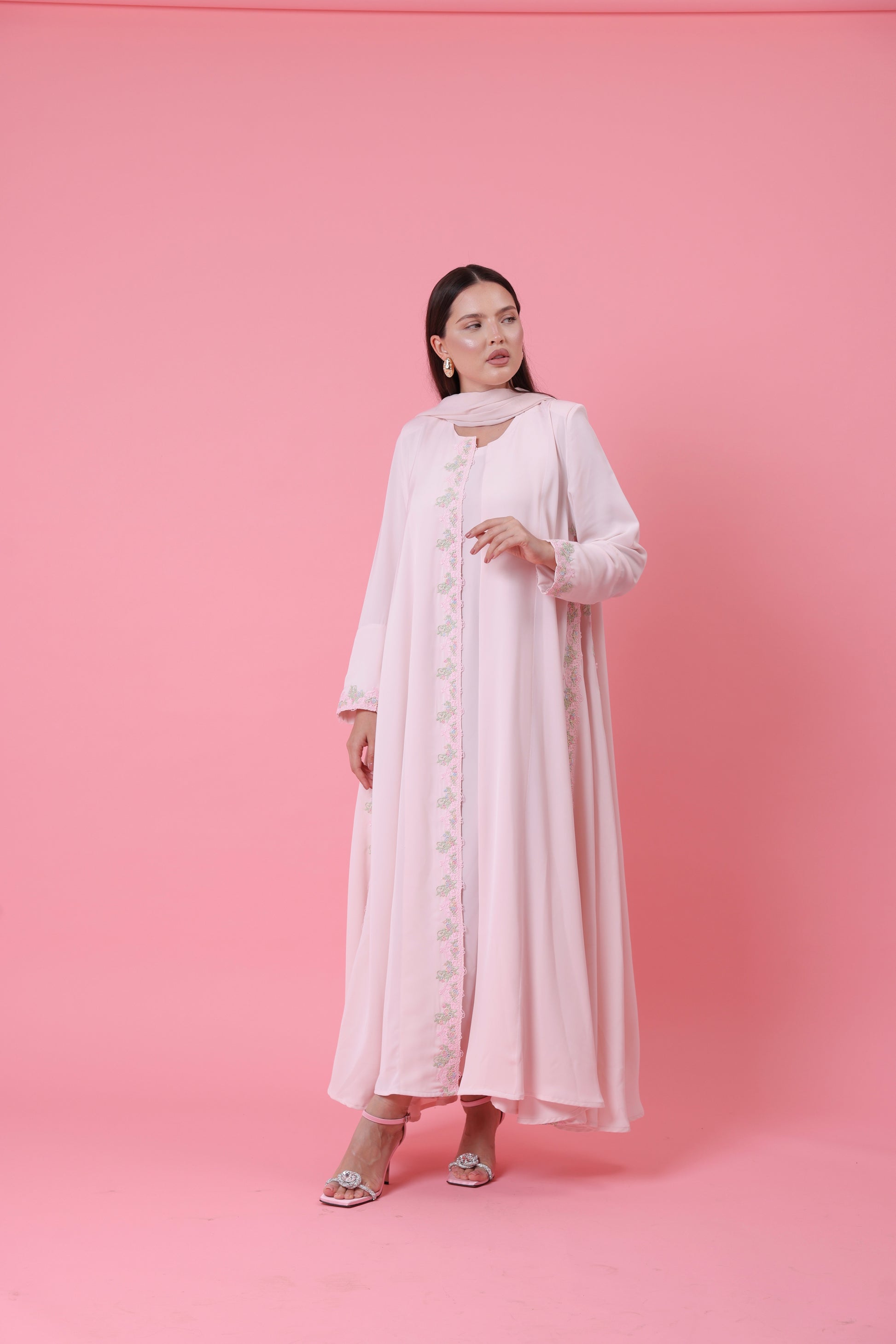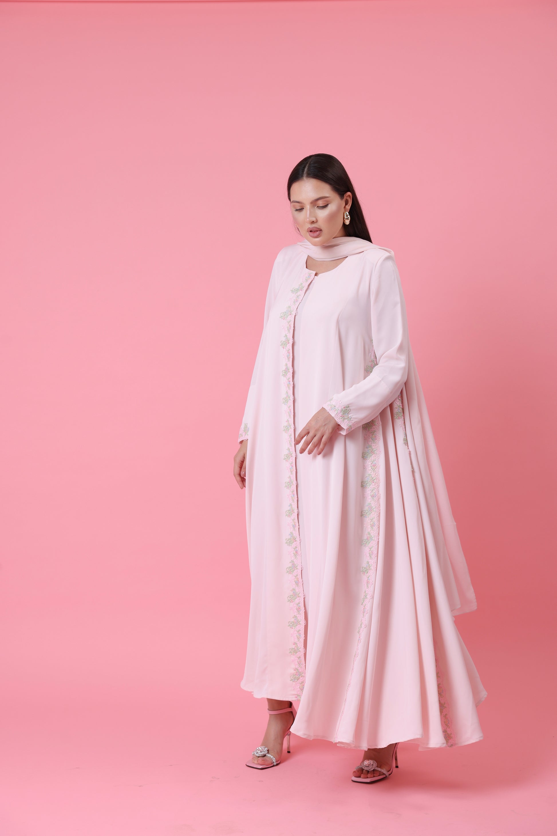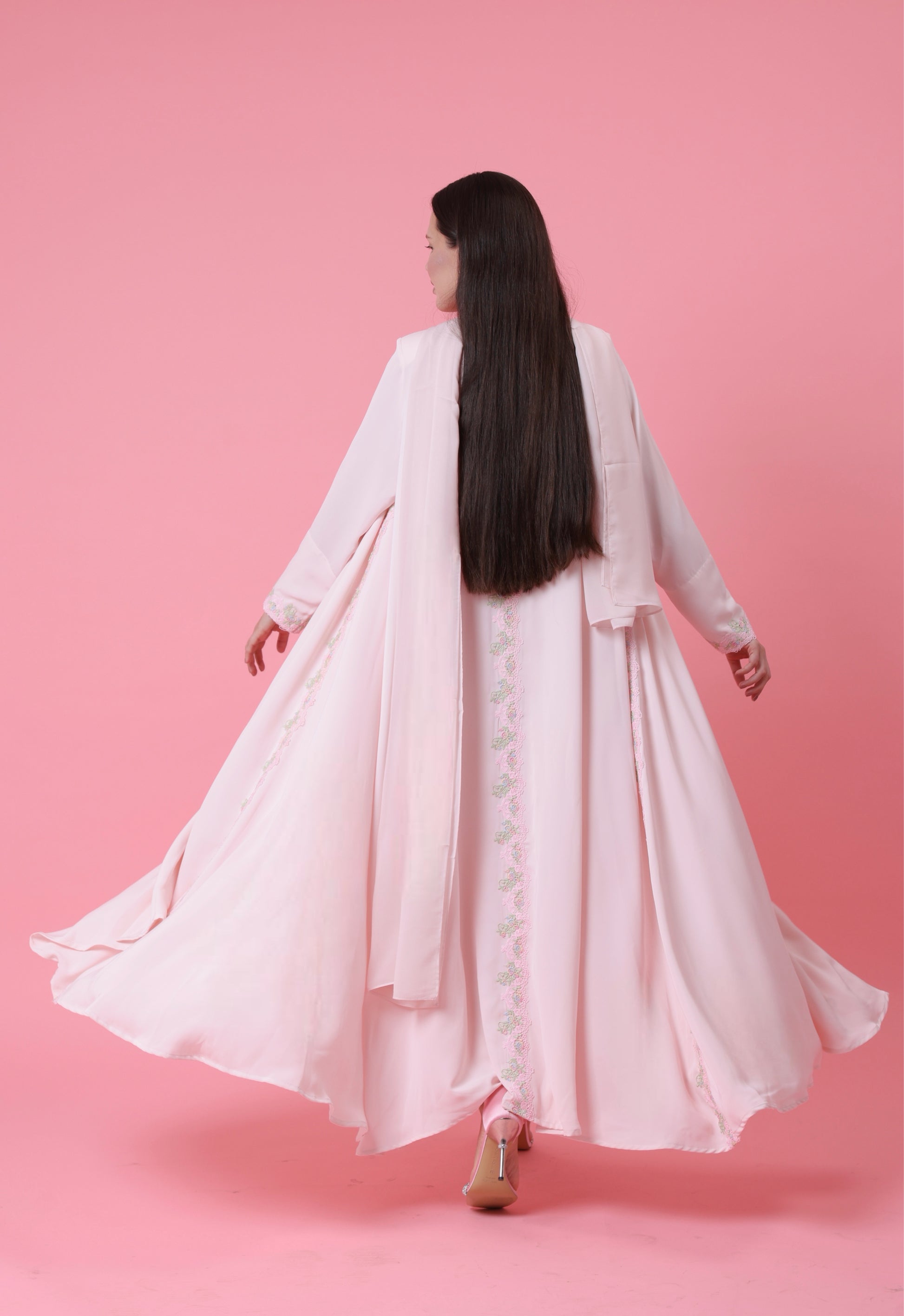 Soft blush-pink crepe trimmed with subtle pastel embroidery—an ode to femininity and calm. Gentle flow and delicate detailing make this a daylight favorite. Comes with matching sheila , inner dress is NOT included.