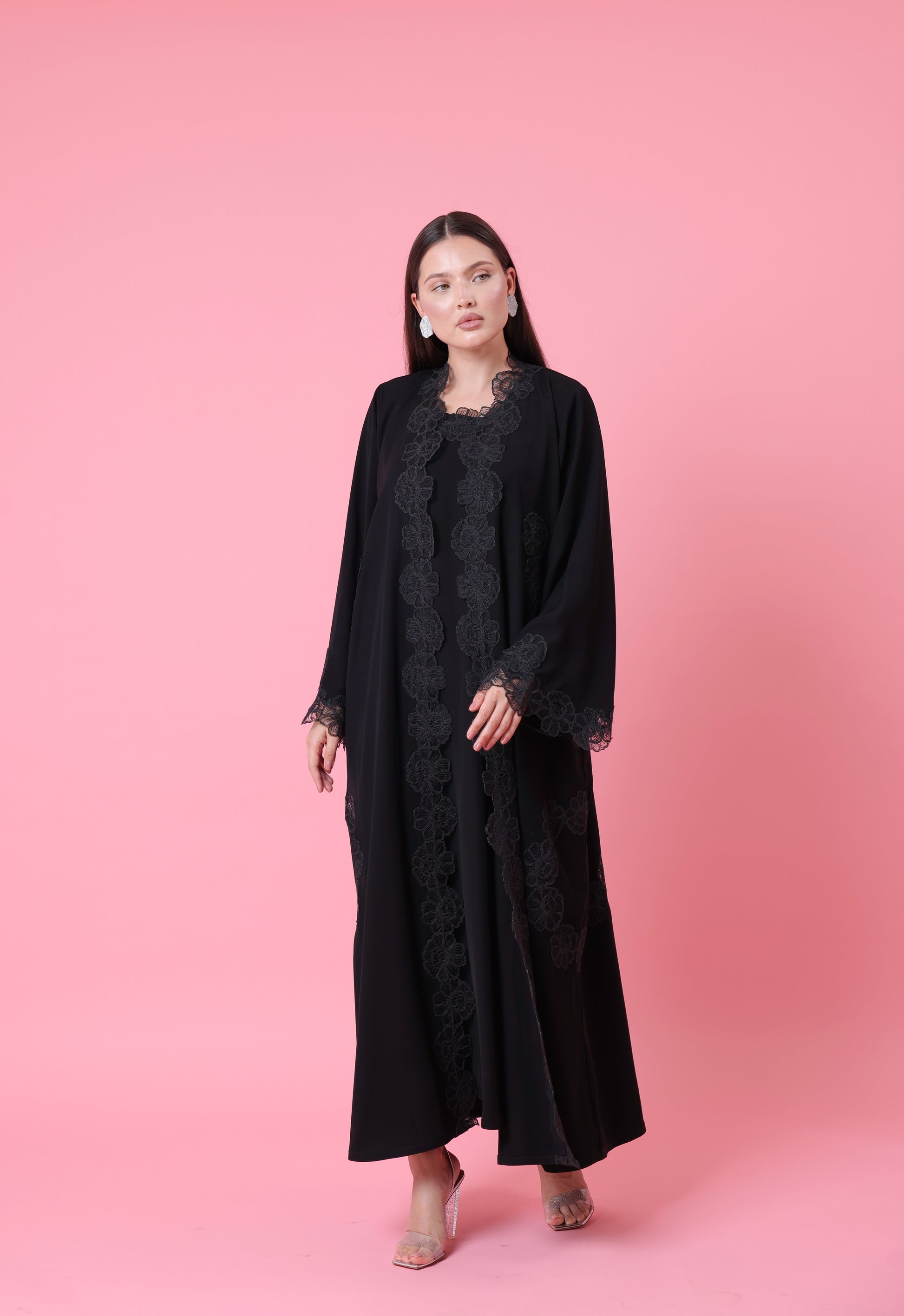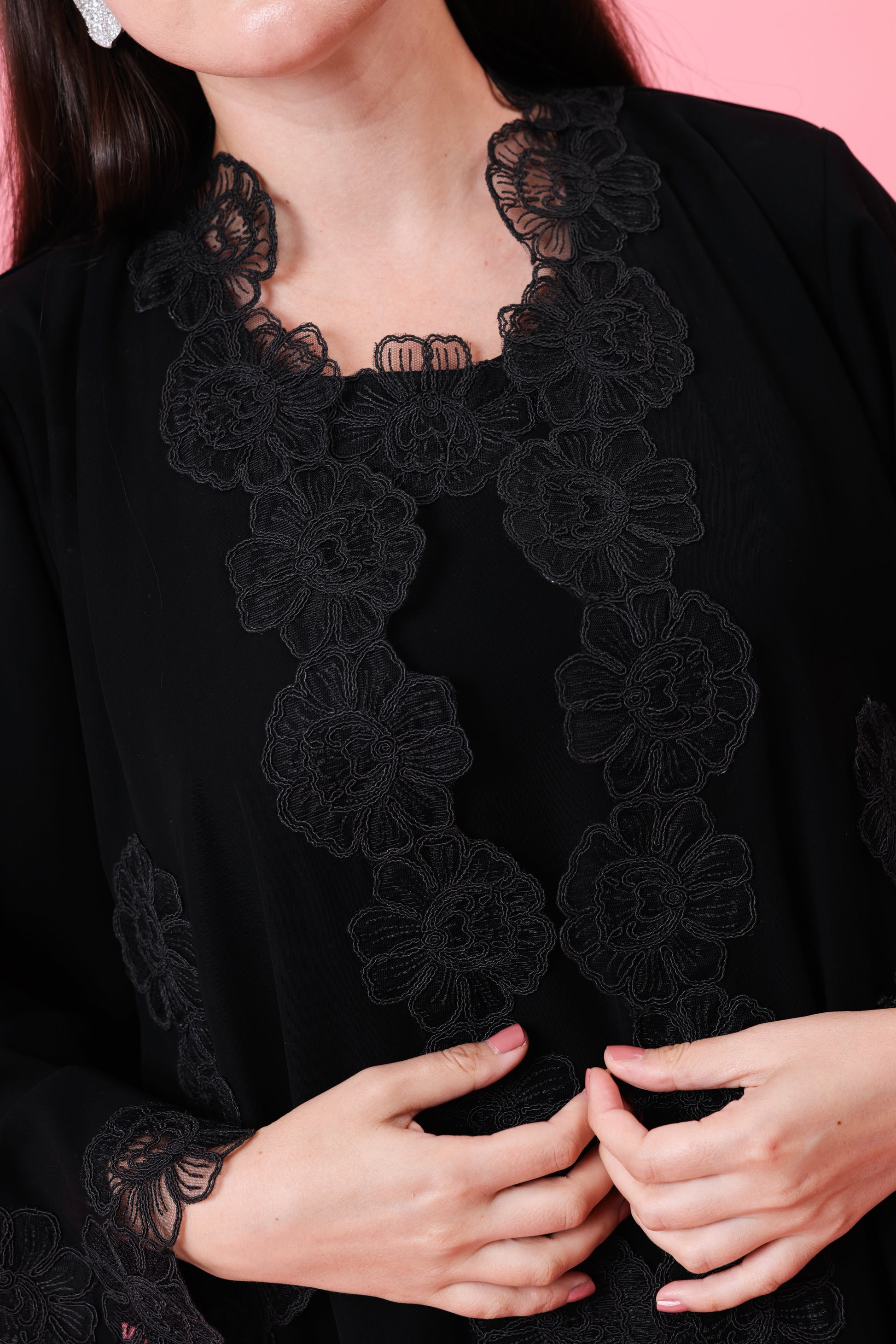 Refined minimalism with a romantic edge—black Korean fabric with intricate lace-like embroidery through the center and cuffs. Matching sheila and inner dress included.