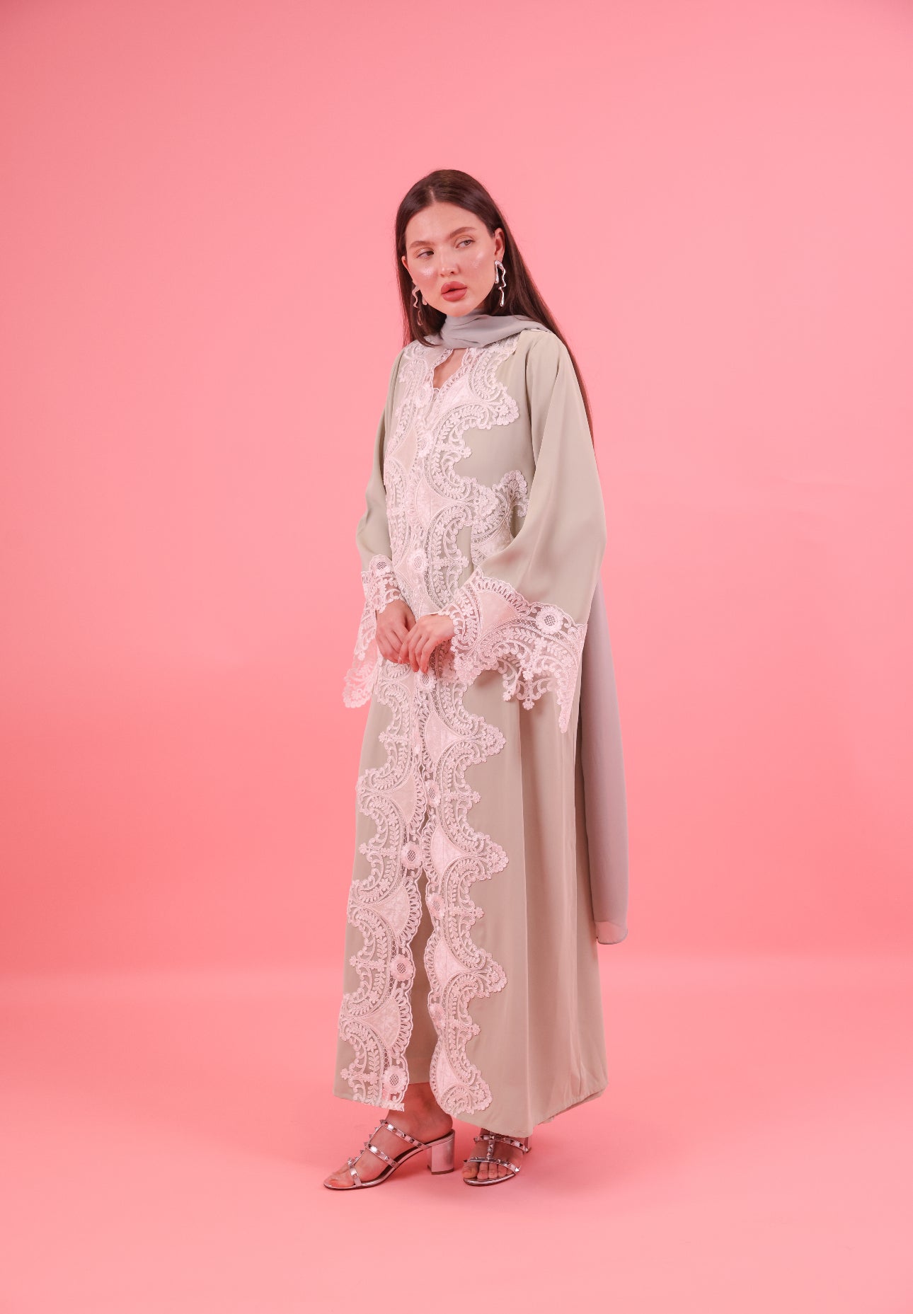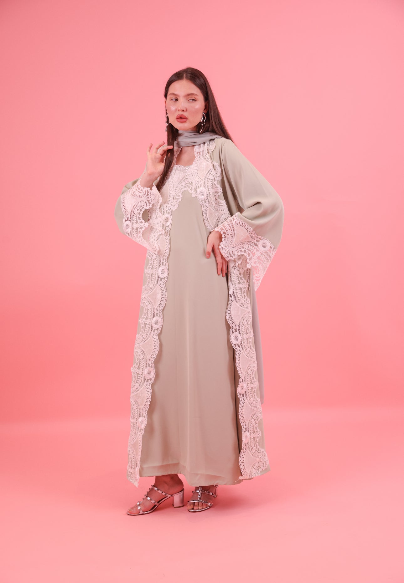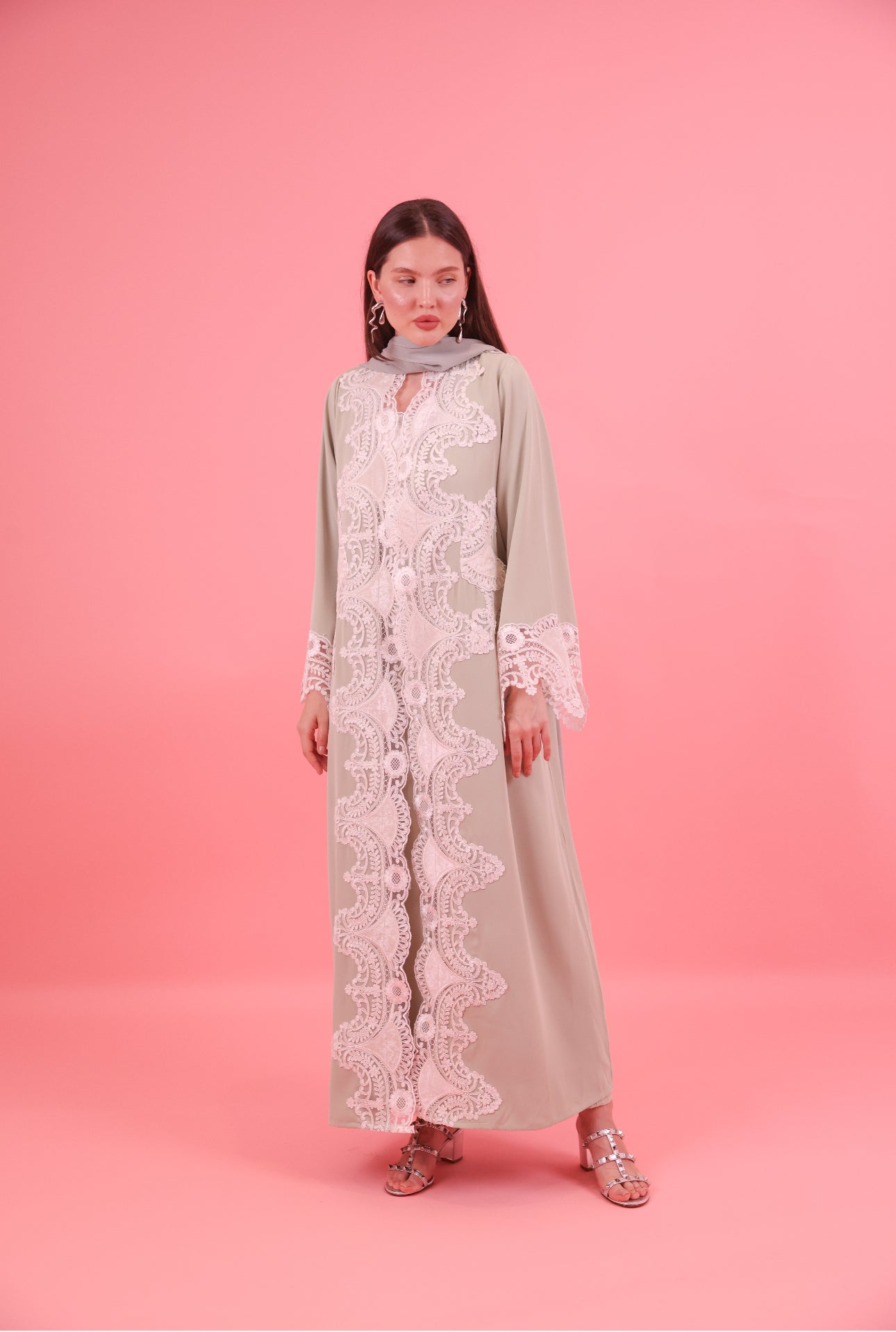 Abaya ( Butter crepe pistachio material with lace velvet trim )