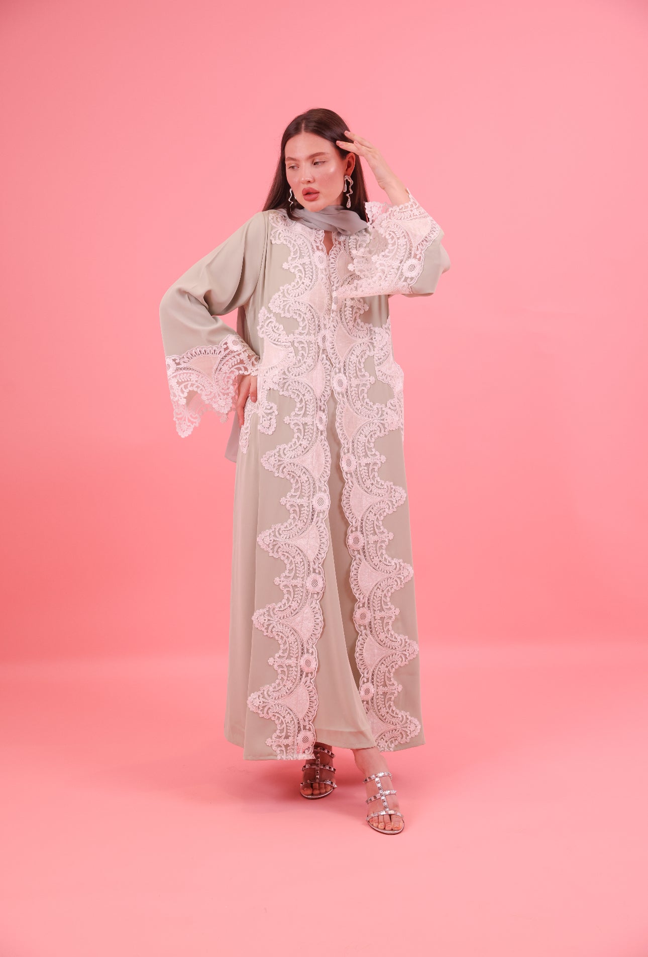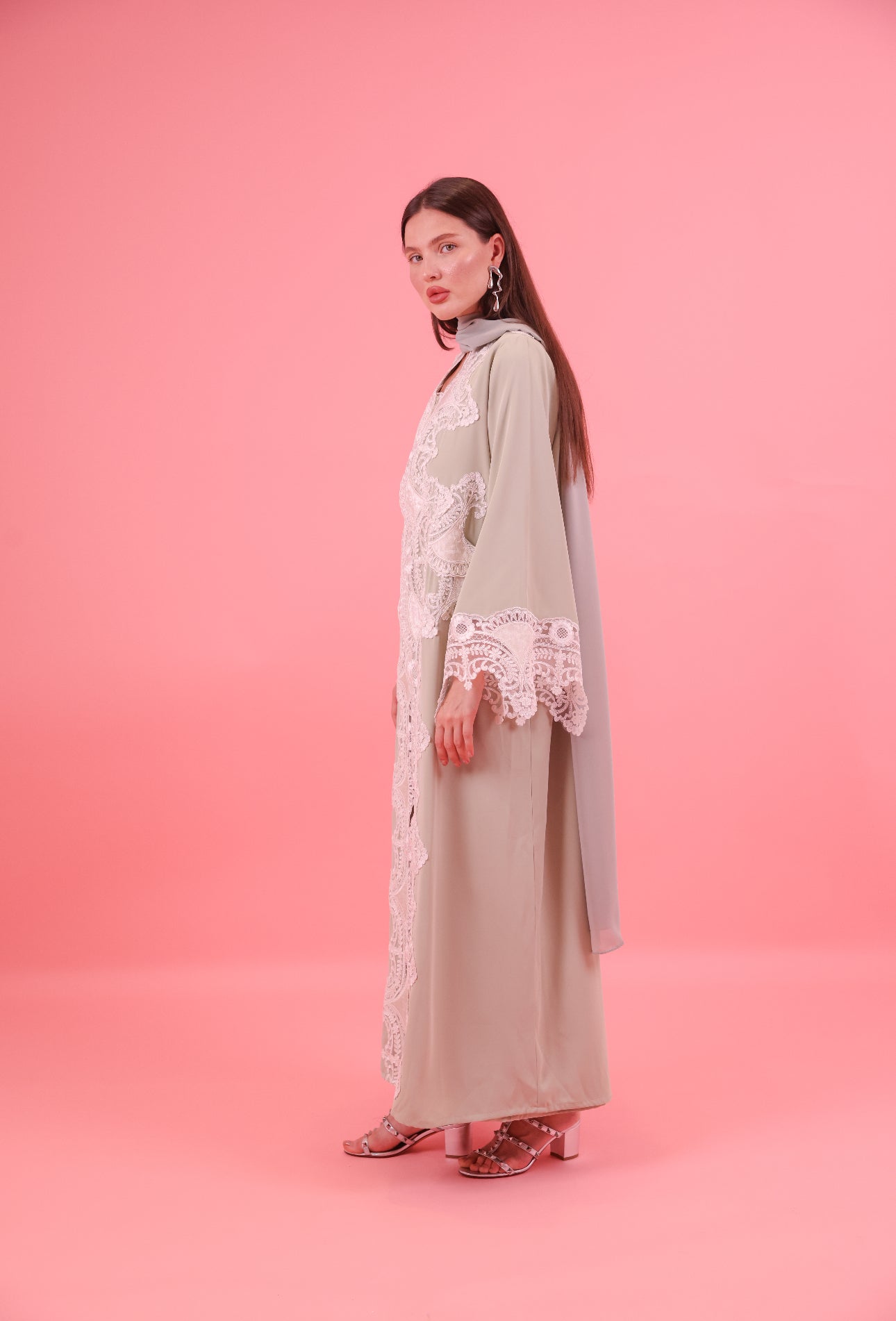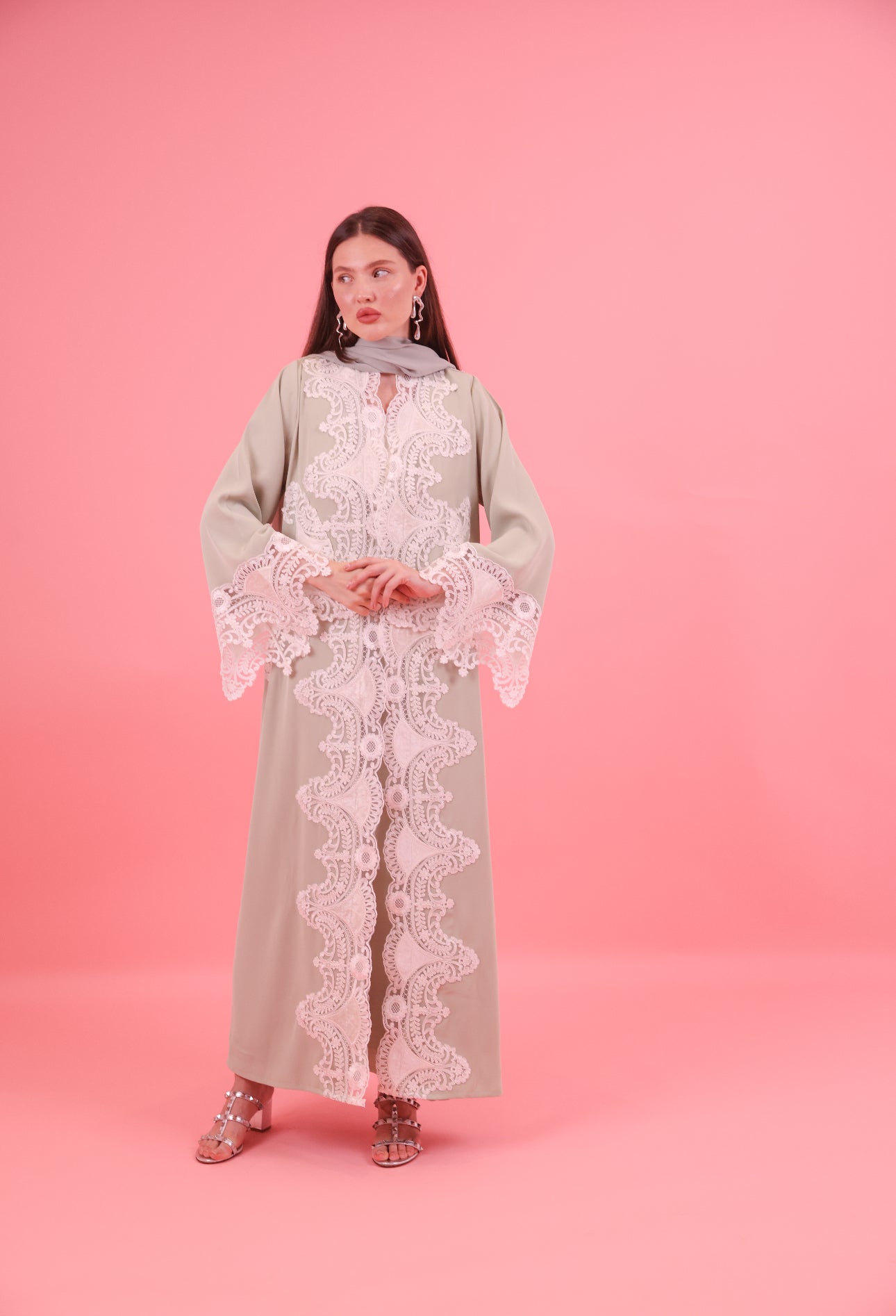 Abaya ( Butter crepe pistachio material with lace velvet trim )