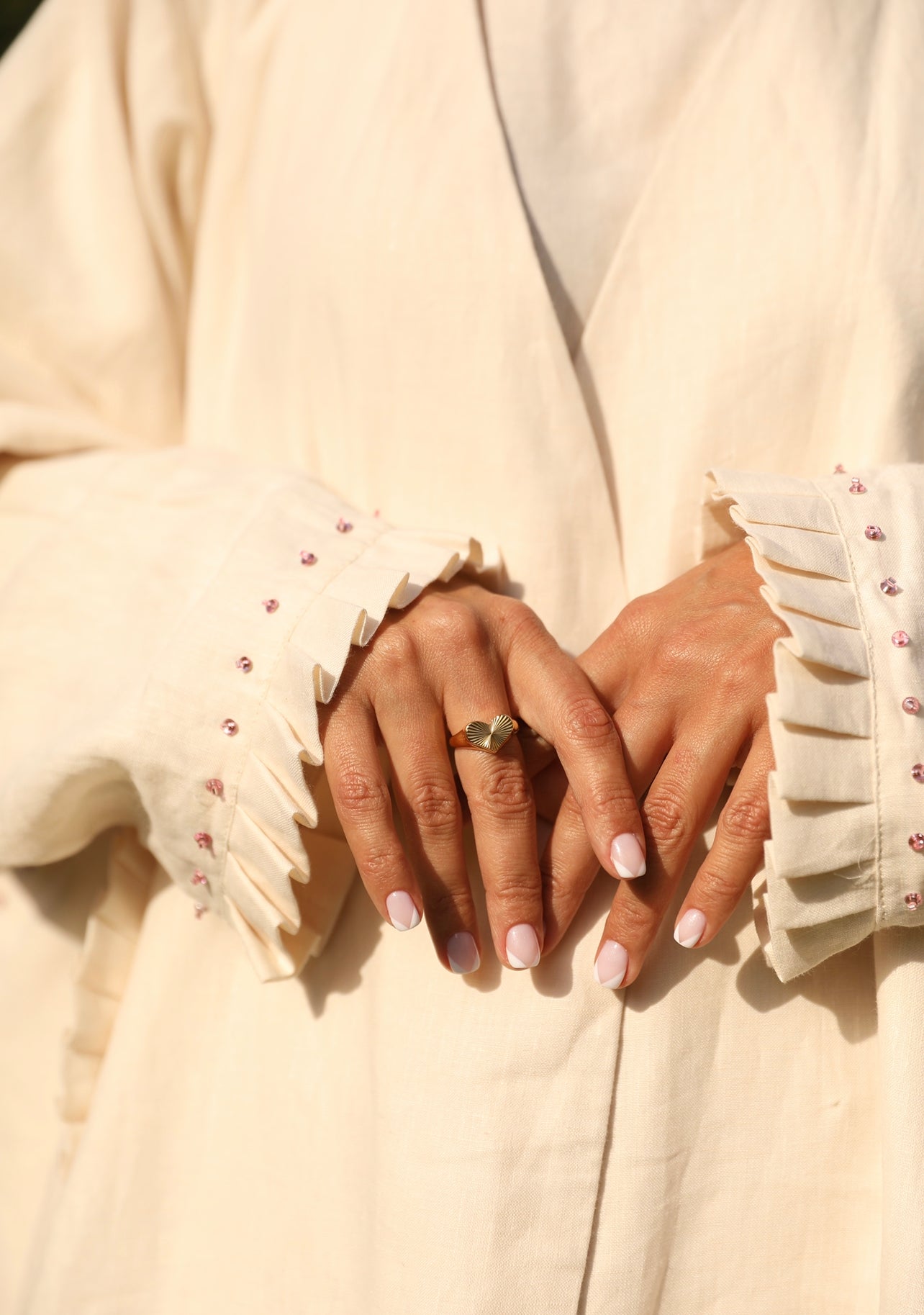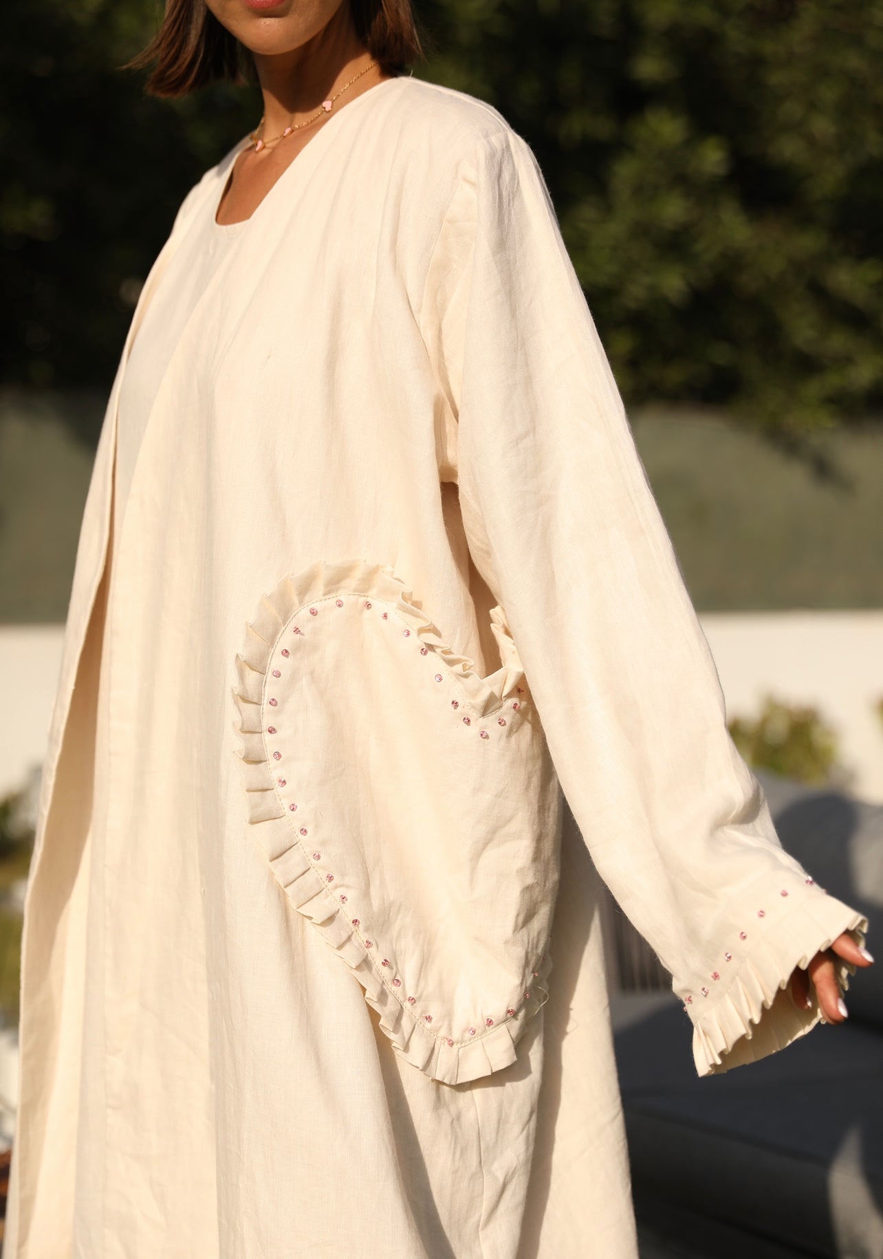 - Abaya with pink sequin trim on heart patch and arm trim