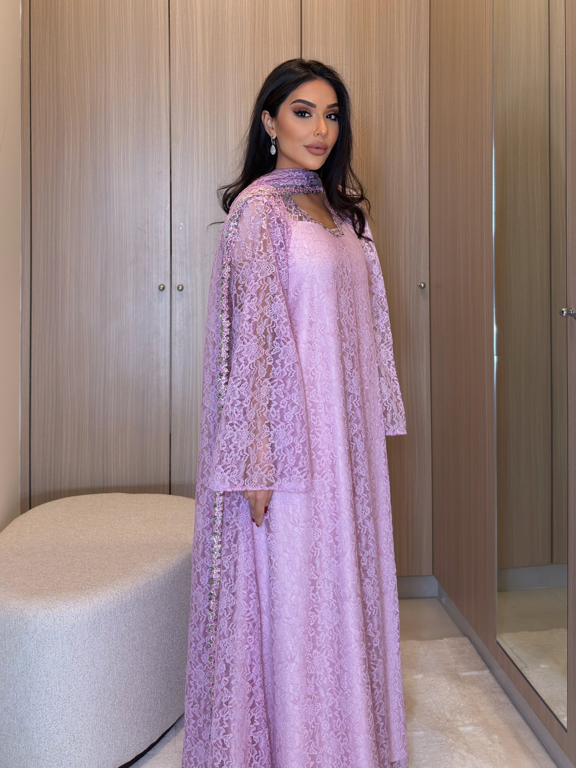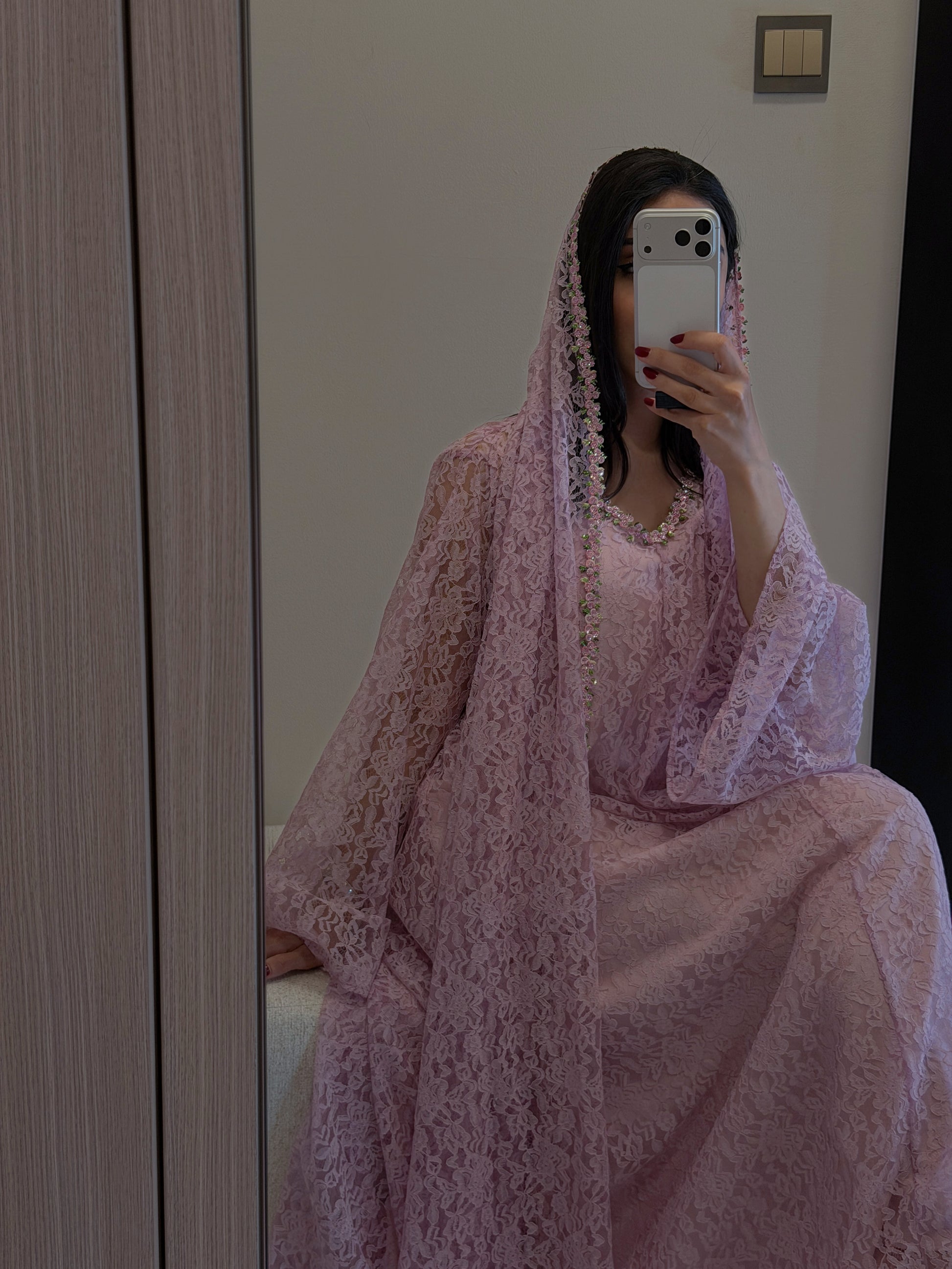 The Rose Lace Set features a flowing lace bisht layered over a matching inner dress in a soft rose hue. The silhouette is relaxed and graceful, designed to drape effortlessly while maintaining structure.